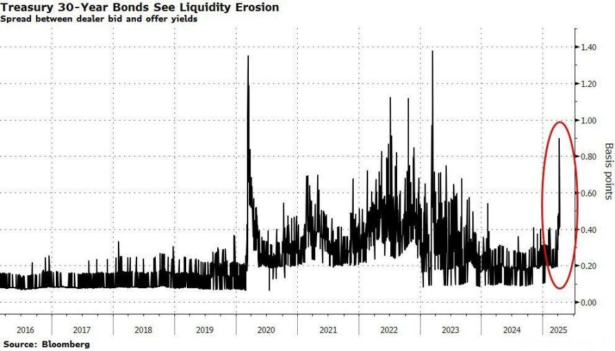 尽管本周 30 年美债跌幅没有延续上周,出现全面扩大的走势,但基准 30 年期债券的买卖价差出现了一些裂缝 —— 这是美国国债收益率曲线长期流动性下降的一个讯号。本周价差几乎达到了整整一个基点,这是自 2023 年初以来从未见过的水平。