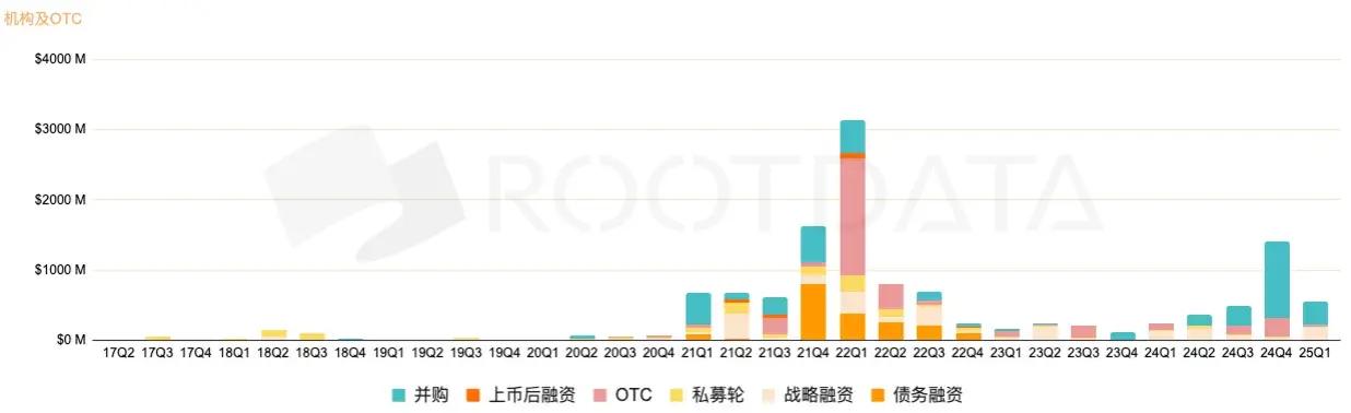 加密公共融资市场遇冷后,私募轮与OTC交易量逆势增长35%。2024年Q4和2025年Q1通过场外完成的融资达19亿美元,并购和OTC占当期总额的75%。这种"桌下交易"的盛行,反映出机构投资者对流动性的焦虑——通过定制化的代币解锁条款和回购协议,尽可能降低市场波动对投资组合的冲击。