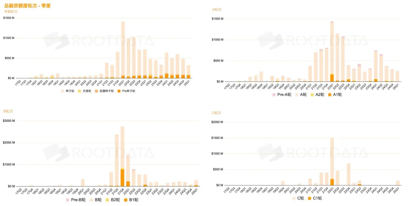 RootData数据显示,加密融资越后期项目融资金额收缩约明显,2021年周期红利期导致估值过高,现今创始人项目估值在A轮甚至种子轮被榨干,C轮自2023年Q3至2024年Q4无机构愿意公开投资。战略融资依旧维持平稳,而并购及OTC交易表现出机构资金在流动性匮乏的市场情况下,更愿意场外达成桌底协议。