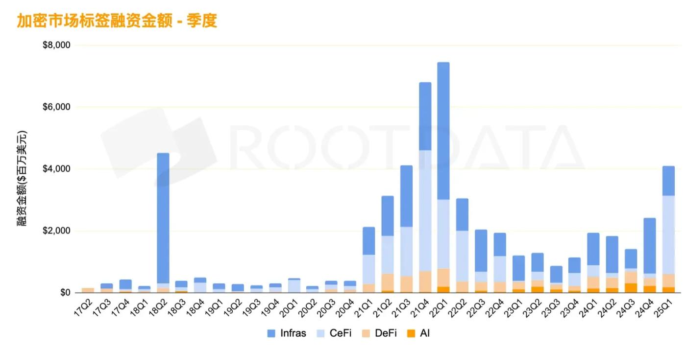 2025年Q1数据显示,当加密社区仍然沉迷在AI MEMES的神话中,踊跃效仿AI史上第一个聊天机器人ELIZA,成为加密史上的去中心化ELIZA时。 加密领域机构投资呈现明显分化:CEX与托管类项目融资占比自DeFi盛夏及FTX垮台后巅峰期的90%萎缩至45%,而AI、DeFi与基础设施项目逆势增长,占据当期融资总额的58%。