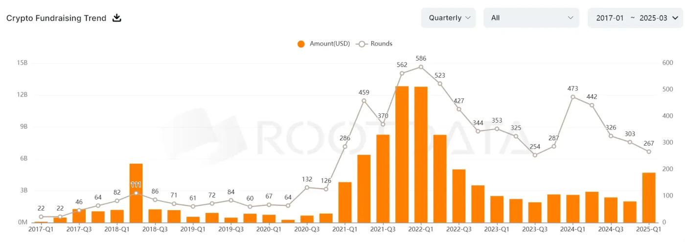 - 2021年周期中,种子轮融资额中位数高达470万美元,而2025年Q1已回落至400美元。总融资额萎缩下,其占比不断下降,表明投资机构对加密种子项目的投资兴趣不断下降。