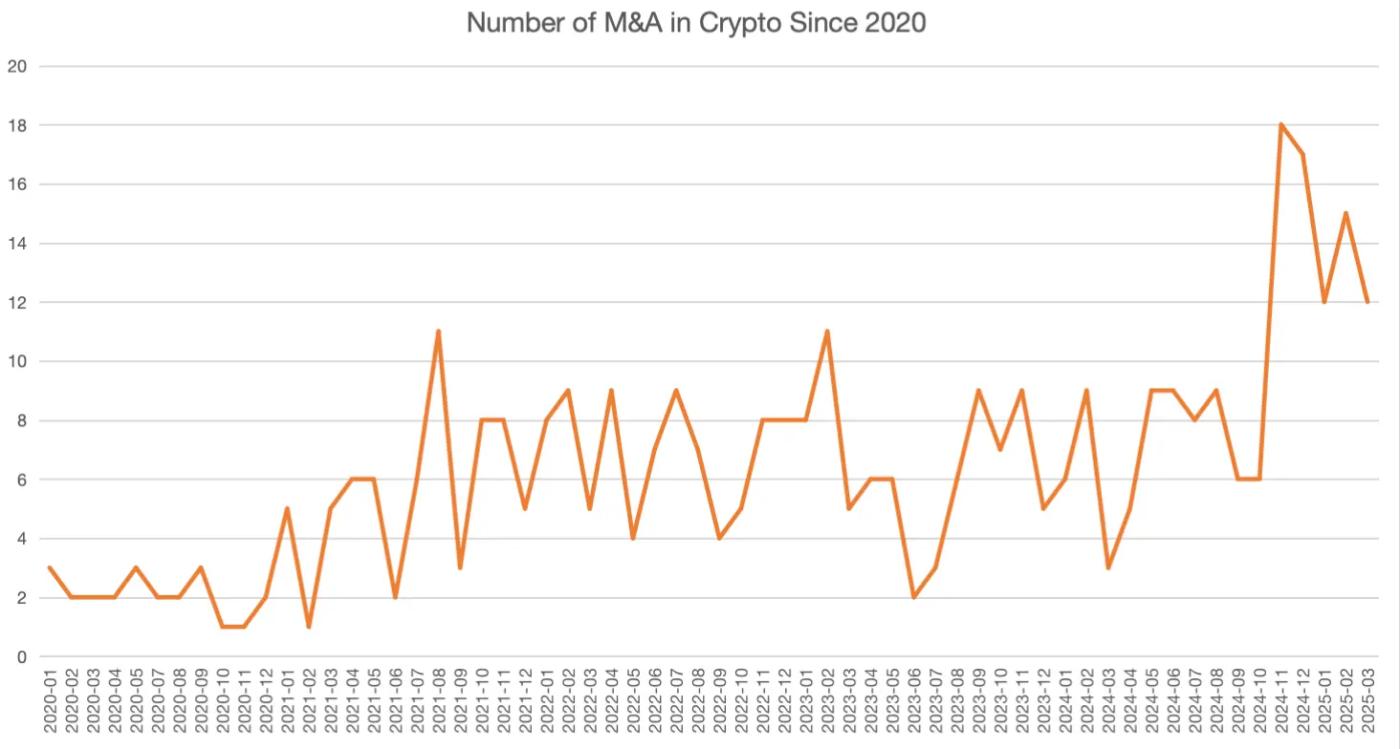 眼下,美国加密企业正迎来一波IPO和并购热潮。十多家美国加密公司正努力抓住窗口期推动上市。此外,越来越多项目通过寻求并购实现退出,自2024年11月以来,已连续5个月并购数量超过10起。且大额并购频发,并购金额不断突破加密历史新高。加密市场进入整合和机构化阶段。一站式、一体化的平台型加密巨头将不断出现。