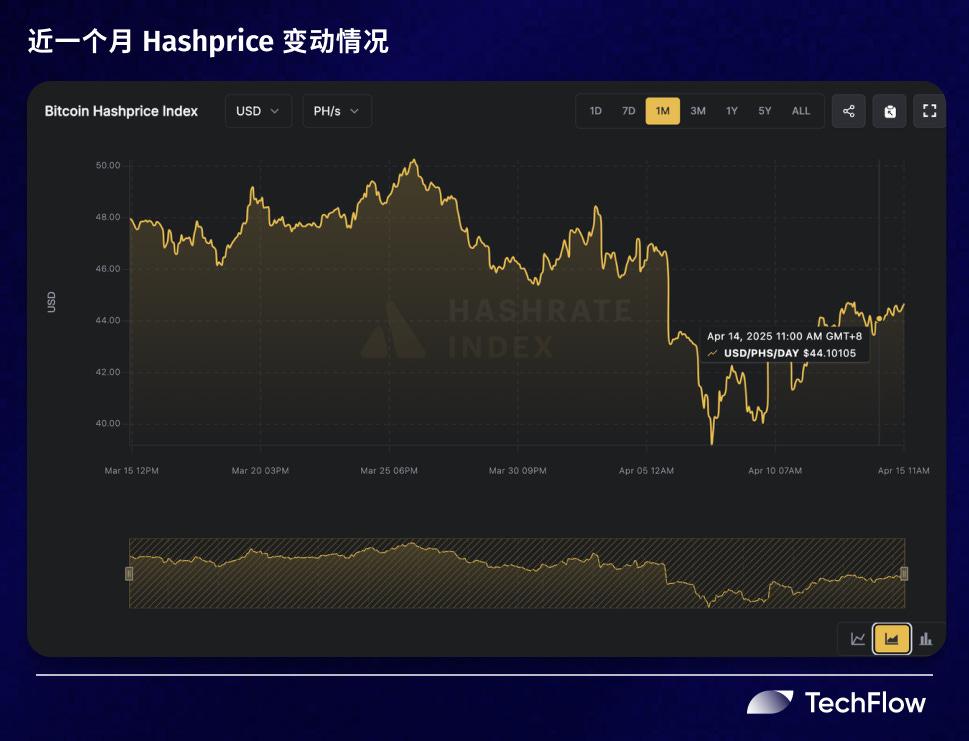 受到上述关税政策给美国矿企带来的巨大成本打击,2025 年 4 月 7 日,比特币的哈希价格 (衡量挖矿盈利能力的指标)跌破 40 美元/小时/秒 ,创下 2024 年 9 月以来的新低。虽然在 4 月 9 日特朗普宣布 90 天暂停期之后,市场有所回暖,但比特币的哈希价格也只是在低于45美元/小时/秒 的水平徘徊,近 4 日都维持在 44美元/小时/秒左右,仍然处于2025 年以来的低值。