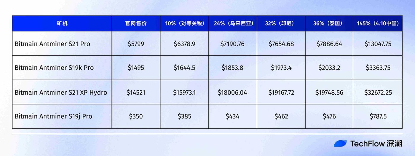 下为Top 10 Bitcoin Mining ASIC Machines for 2025中部分比特大陆矿机在4月 2日公布关税清单下的价格对比(中国更新)
