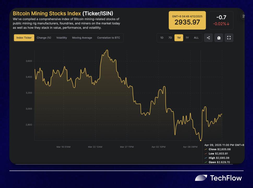 在此背景下,美国上市矿企股价应声下跌。比特币矿业股票指数在 4 月 4 日和 4 月 9 日迎来两个波谷,这一指数是根据当今市场上公共采矿设备制造商、铸造厂和矿工的比特币采矿相关股票综合加权计算得到的。