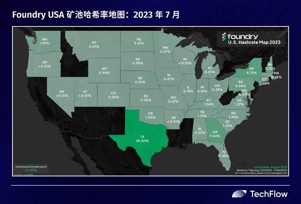 据2024 年 7 月 18 日美国能源信息署报告,德克萨斯州是全美能源生产大州,提供全美约四分之一的国内一次能源。除了丰富的原油、天然气田和煤炭资源,德克萨斯州还拥有丰富的可再生能源资源,风力发电量位居全美第一。与剑桥公布的2021年12月美国各州哈希率分布中的11.2%相比,德克萨斯州在Foundry USA2023 年 7 月更新数据中占全美哈希率已近 30%。