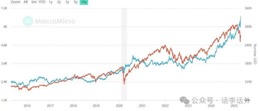如果我们将黄金和标普 500 的历史走势做个简单对比的话,就可以发现,其实从 2020 年开始,美股和黄金的表现就已经开始出现过比较明显的差异。如下图所示(图中蓝色的线是黄金、红色的线是S&P500)。
