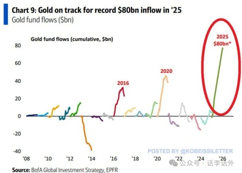 根据 The Kobeissi Letter 的数据显示,今年以来,黄金基金净流入已创下 800 亿美元的纪录,比 2020 年全年创下的前高点还高出了两倍,投资者正在以创纪录的速度向黄金市场注入资金进行避险(也有一部分资金可能是进行短期投机)。如下图所示。
