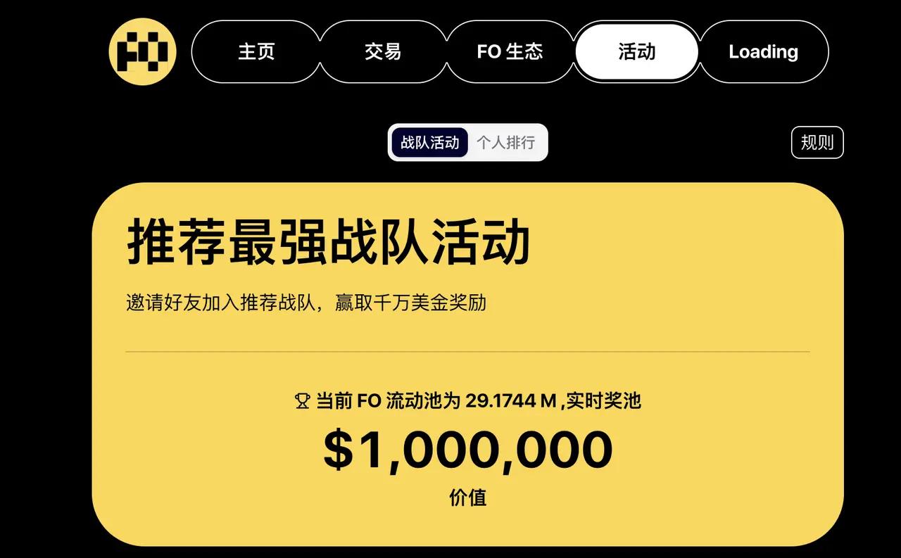 战队需持仓10,000 USDT以上按贡献值瓜分奖池;个人奖需加入战队且购买1,000 USDT(以$FO净值计算)。详情可上官网查看。
