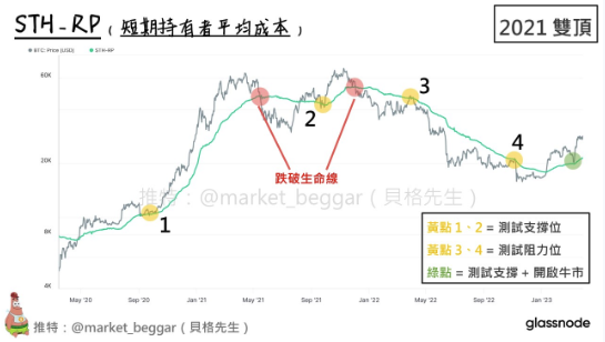 上图是 2021 年双顶时期的 STH-RP 图表,我们可以先观察「红色标记处」:不论是第一顶还是第二顶,在价格跌破 STH-RP 之后,其实基本就算是「熊市开启的右侧讯号」了。