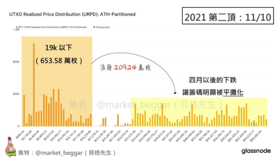 上图是 2021 年第一顶的筹码结构,当时在顶部的堆积量相对很小,并且有大量的低成本筹码仍未被派发,成本在 19k 以下的筹码仍处于明显堆积的状态,量体高达 862.82 万枚。