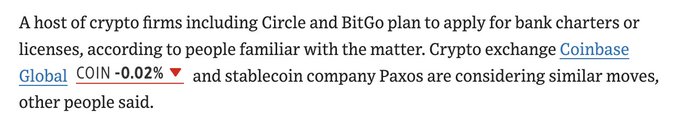 🇺🇸 美国加密公司Circle、BitGo、Coinbase和Paxos正在寻求银行牌照,据《华尔街日报》报道。 国会中的两项议案旨在监管稳定币,STABLE法案和GENIUS法案提议进行联邦监管并制定更严格的规则。