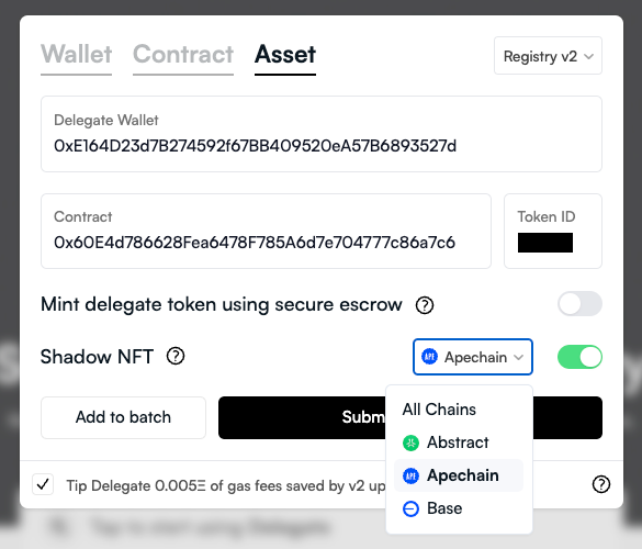 我们很高兴能为Ape链上的Shadows提供支持。使用您的委托钱包代表您的BAYC、MAYC、Koda和BAKC保险库来证明所有权。要在@delegatexyz上创建一个Shadow,点击委托资产 > 填写合约和代币信息 > 选择Ape链 > 并提交。