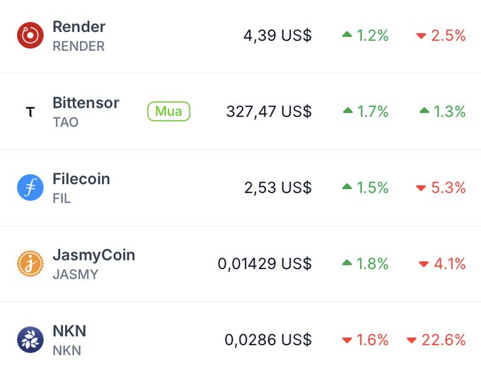 🚀 今日DePIN前5名 🔥 保持警惕,赌徒们!以下是当前最热门的DePIN项目: 1. @rendernetwork(RNDR)– +1.2% 仍在运行GPU,略微下跌。 2. @TheBittensorHub(TAO)– +1.7% AI老大继续展示实力 🧠 双向上涨。 3. @Filecoin(FIL)– +1.5% 今日上涨,