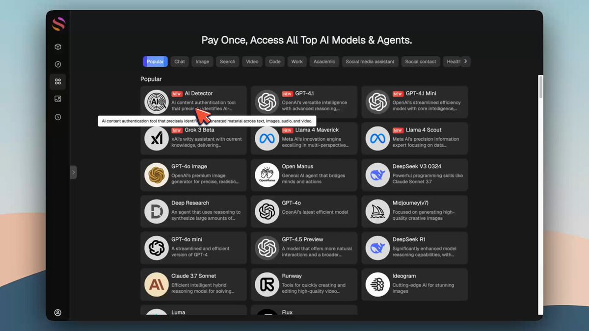 在一个地方访问所有主要模型 ChatGPT-4.1、Claude 3.7、Grok 3、Midjourney v7、Llama 4、 Gemini 2.0。