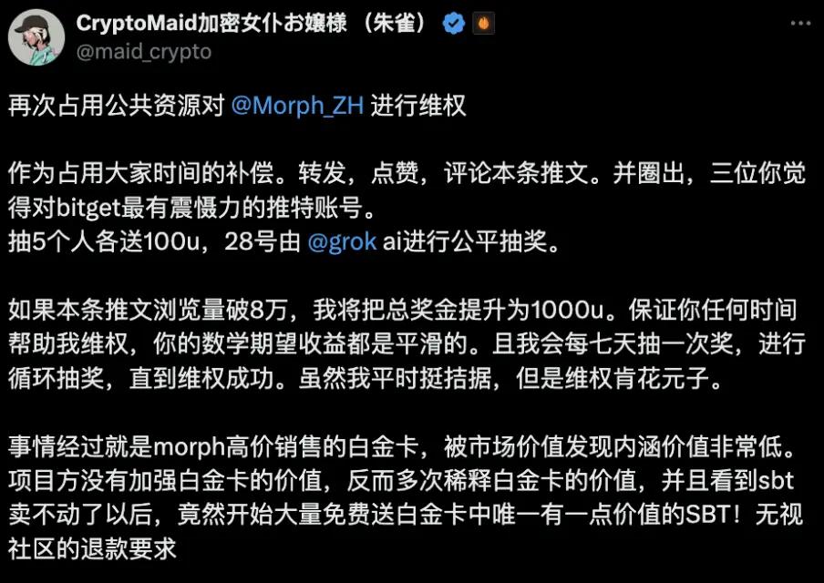 加密大V朱雀,也开始发文抨击Morph,表示项目方在白金卡发布后,并未加强相应的权益与价值,反而多次稀释其价值。