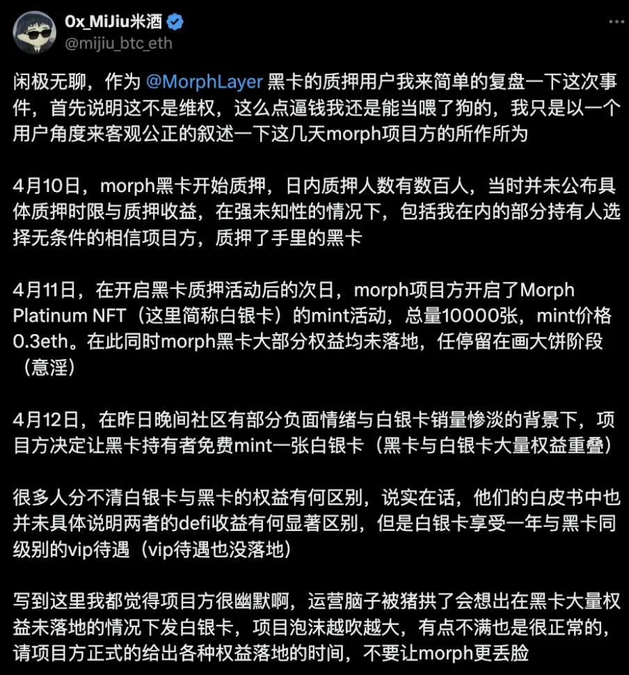 此前质押黑卡的加密博主0x_MiJiu米酒在线喊话Morph项目方,要求其尽快对黑卡以及白金卡的权益给出具体阐述以及具体落地时间。
