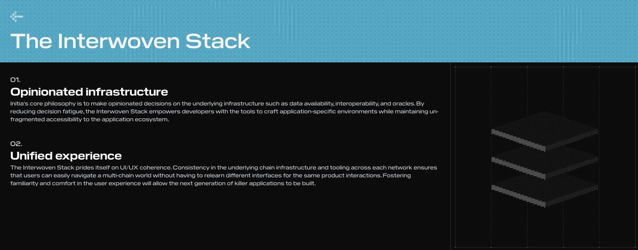 Initia 是一个基于 Cosmos SDK 构建的第一层区块链,结合了具备主观设计理念的 Rollup 架构。它通过将独立的应用链(Appchains)编织成一个“交织式”网络,实现链间经济激励的一致性,并支持无缝的跨链资产转移。