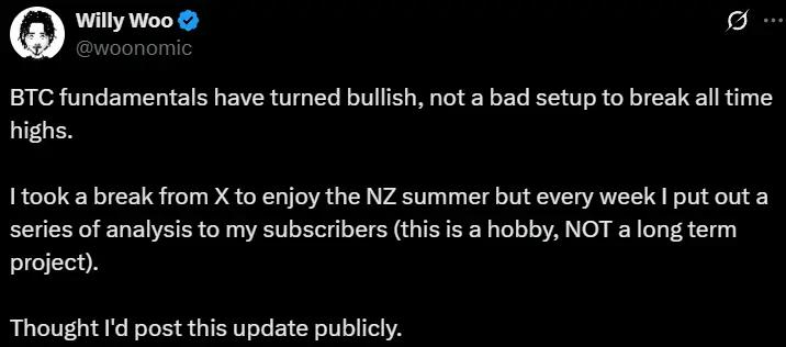 ChainCatcher 消息,加密分析师 Willy Woo 表示,比特币的基本面已经转向看涨,资金流入网络正在增加,这为其突破历史高点创造了良好的条件。他指出,市场的总体和投机性资金流都已触底,当这两者结合时,会形成一个有利的市场环境。目前市场流动性回升,下行风险较小。