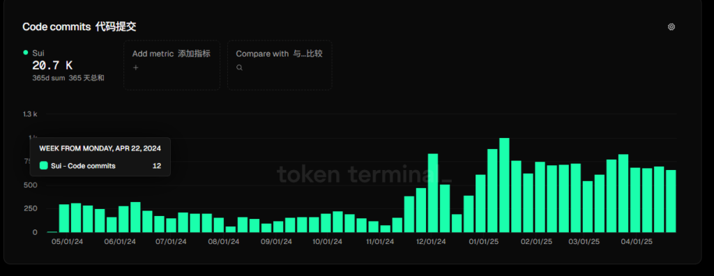 此外,开发者的活跃也是 Sui 网路增长的底层原因之一。在 Github 上,Sui 网路的程式码提交近期也较为频繁,从 2024 年 12 月开始,Sui 网路的程式码提交频率就进入高峰,基本都维持在每周 500 次以上,而此前的这一资料基本维持在 250 次左右。作为对比,Solana 和 Aptos 的的程式码提交频率基本维持在 100 左右。
