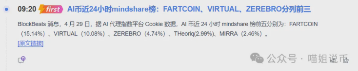 AI 题材成为近期最大赢家,VIRTUAL、COOKIE、AIXBT、CGPT、SHELL 等项目频繁登上涨幅榜,一级市场热度持续升温,Fartcoin 等“阴谋盘”也轮番登场,炒作气氛渐浓。