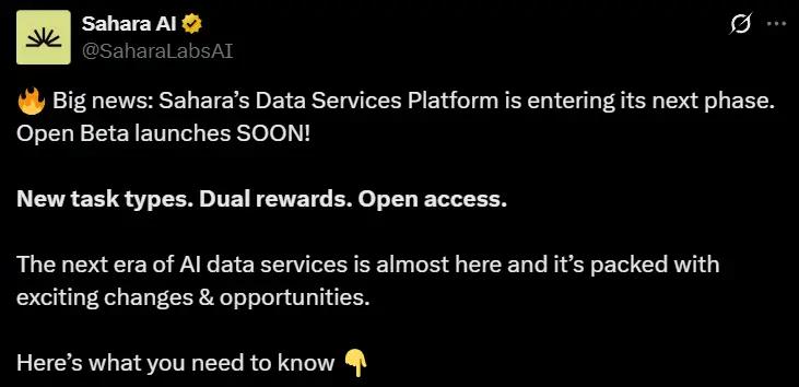 ChainCatcher 消息,Sahara AI 宣布其数据服务平台(DSP)开放公测版本。DSP 作为开放链上平台,支持用户通过贡献构建高质量、可验证的 AI 数据集并获得奖励。