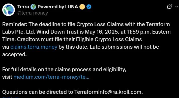 ChainCatcher 消息,Terra 发推表示,债权人向 Terraform Labs Pte. Ltd. Wind Down Trust 提交加密损失索赔的截止日期为北京时间 5 月 17 日 11:59。