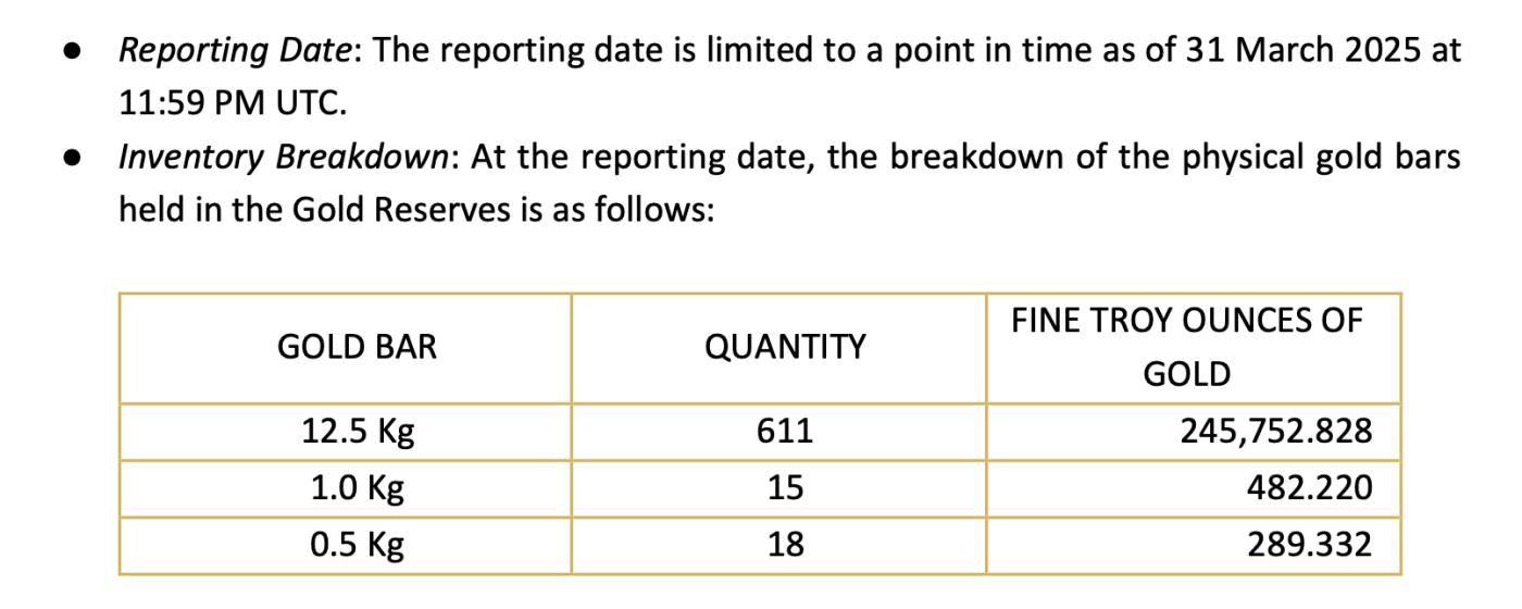 Tether控股公司刚刚发布了2025年第一季度Tether Gold (XAUT)的资产确认报告,确认超过7.7吨实物黄金完全支持流通中的代币数量。根据由BDO Italia S.p.A.进行的报告,截至2025年3月31日,总计246,524.33金衡盎司纯金存储在瑞士的仓库中。