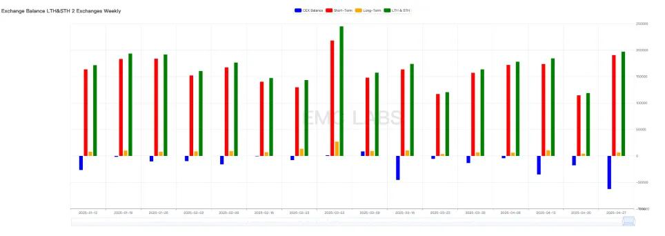 伴随价格大幅反弹,本周长短手链上抛售规模有所增大,主要抛售来自短手。全周链上抛售规模增至 197040.26 枚,其中短手 190568.61 枚,长手为 6471.65 枚。交易所流出大增至 62696.12 枚,为本周期以来最大净流出周,这种流出一方面缓解了市场抛压,一方面显示出市场抢筹热情殊为强烈。