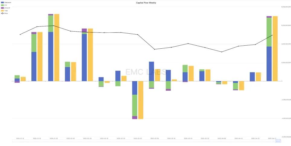 伴随美联储和华府恢复理性,本周稳定币与 ETF 通道资金流入通向,共计流入接近 70 亿美元。