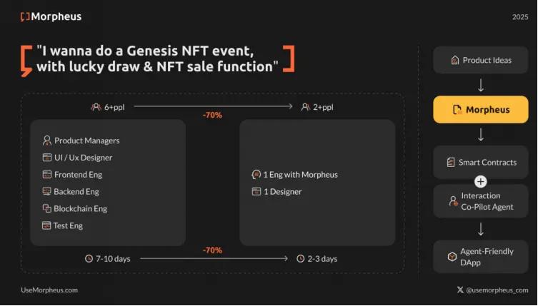 在传统流程中,一个具备抽签与 NFT 发售逻辑的链上应用,往往需要 6 名以上工程师与产品人员、7~10 天开发周期。借助 Morpheus,多智能体系统可自动完成合约生成与交互配置,整个流程仅需 1 名工程师 + 1 名设计师,2~3 天即可交付完整的 agent-friendly dApp。