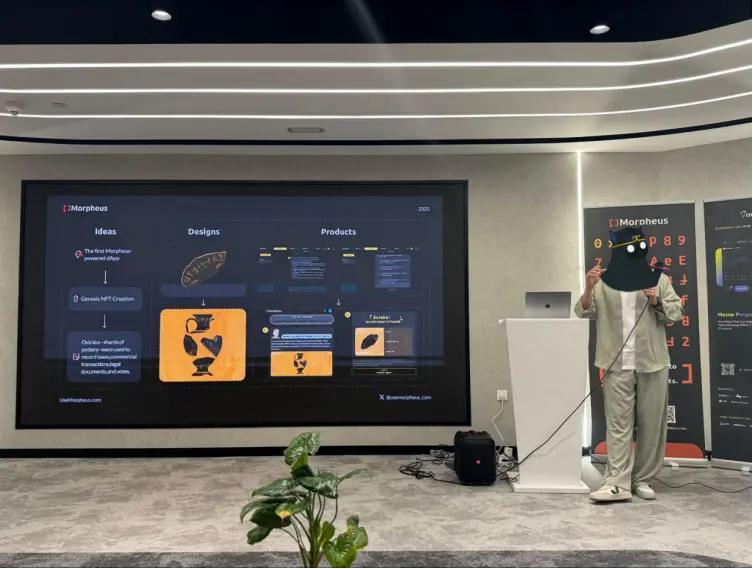 活动现场,Morpheus 联合创始人 Adam Zhao 发表了一场兼具产品性与创意性的主题演讲,演示了如何通过 Morpheus 平台,将原本需要数周开发周期的 Web3 应用,在多智能体协同下压缩至仅两天内完成上线。现场实时展示了从语言 prompt 到合约生成、再到交互逻辑部署的全过程,完整还原了 Morpheus Ostraka 的开发节奏与链上资产生成机制。