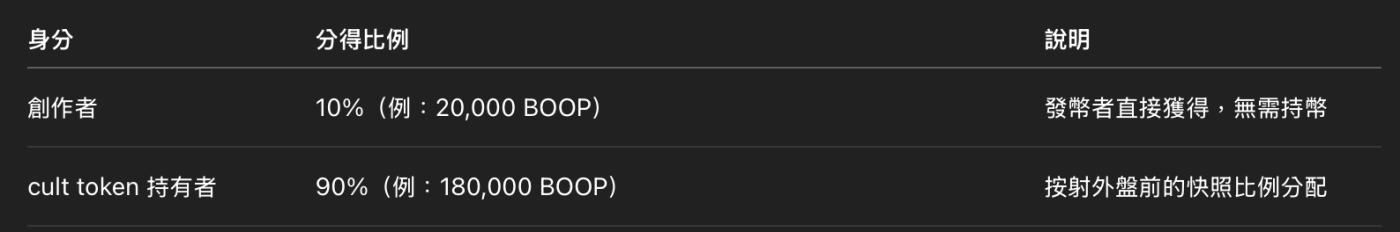 备注:「cult 创作者与持有者」无需是 $BOOP staker,只需参与该 cult 即可获得对应 BOOP,简单来说就是你就算完全不碰 $BOOP,只要玩内盘打狗并成功撑到发射,就会有一些空投。