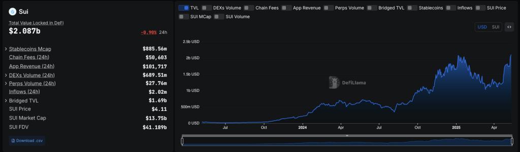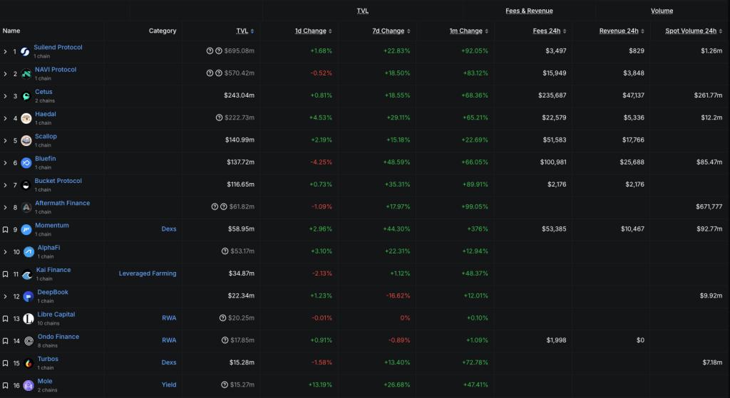 – Sui: DeFi TVL ~$2B,GameFi、NFT、市值验证的 TradFi PoC。