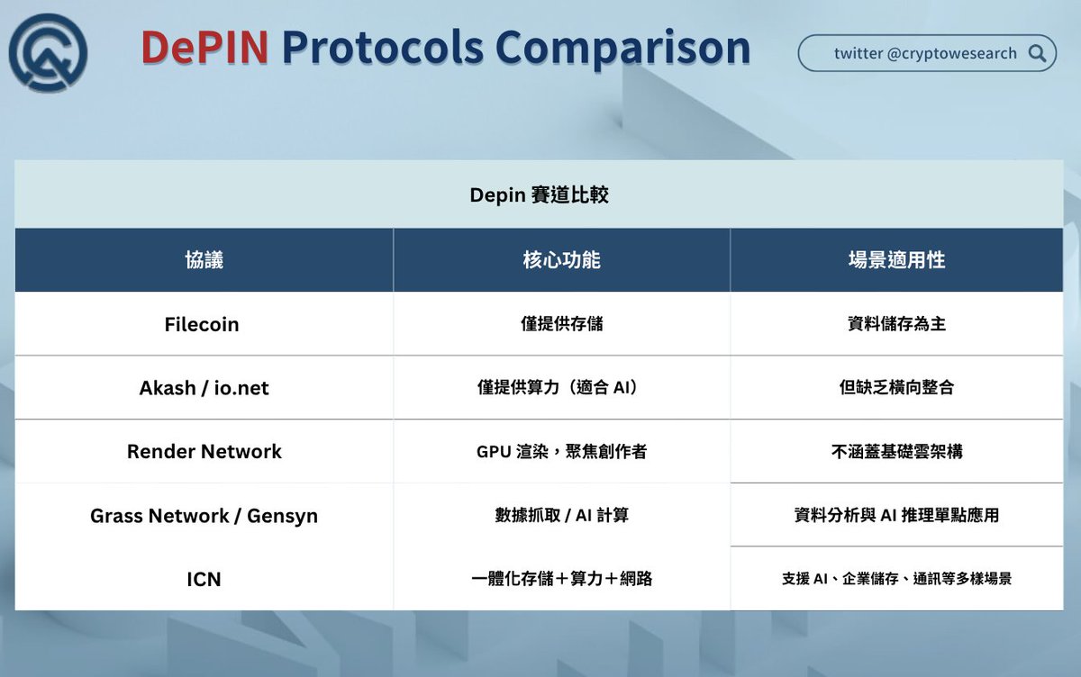 如 Filecoin 只处理储存,Akash 处理算力,导致整合困难ICN 是少数整合 储存、算力与网路的全栈去中心化云平台,跳脱单一功能协议的拼装困境