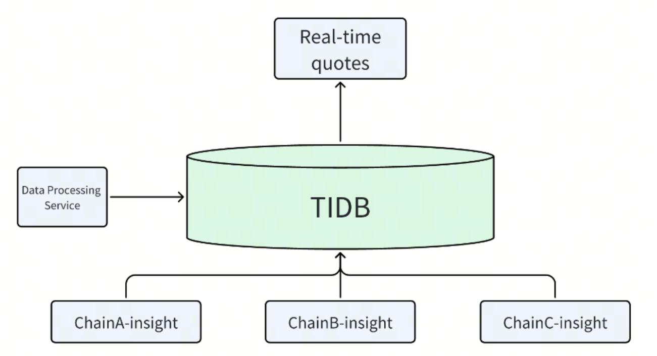 首先 TiDB 帮助 GMGN 简化了数据库架构,在原有架构中,不同的链数据(例如 ChainA,ChainB 或 ChainC)存储在分离的 MySQL 数据库,然后再经过数据平台加工。而在 TiDB 的数据架构中,所有来自不同链的数据都直接储存在 TiDB 中,如下图。