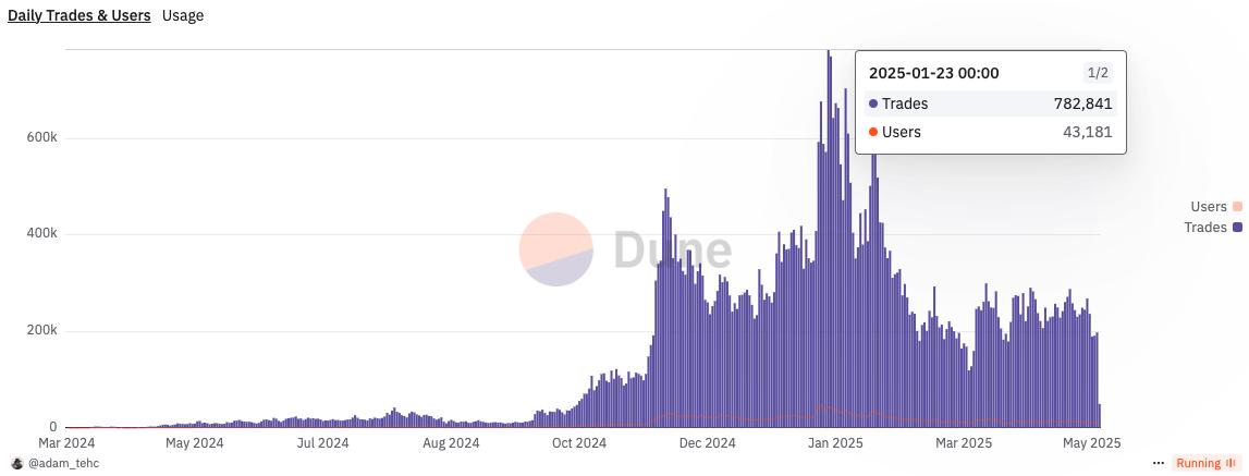 随着 Web3 数据和用户数量的迅速增加,GMGN 当时的数据库难以有效扩展。根据 Dune 数据, 2024 年 11 月 GMGN 平台用户数与交易笔数迎来第一次爆发式增长,日交易数最高达 49.5 万笔,活跃地址数近 30 万;2025 年 1 月迎来第二次爆发式增长,日交易数最高达 78.2 万笔,活跃地址数增长至 43 万。