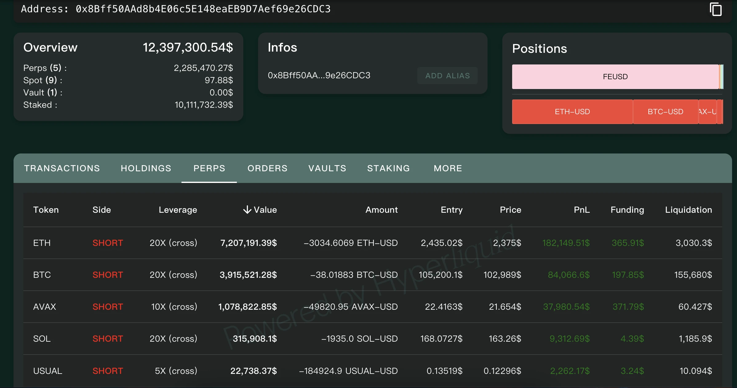 最新资料显示,该地址所有空单均已盈利,其中,ETH 20 倍空单持仓量为 3034 枚 ETH,浮盈约 18.2 万美元;BTC 20 倍空单持仓量为 38 枚 BTC,浮盈约 8.4 万美元;AVAX 20 倍空单持仓量约为 5 万枚 AVAX,浮盈约 3.8 万美元;SOL 20 倍空单持仓量约为 1935 枚 SOL,浮盈约 9000 美元;USUAL 5 倍空单持仓量约为 18.5 万枚 USUAL,浮盈约 2000 美元。