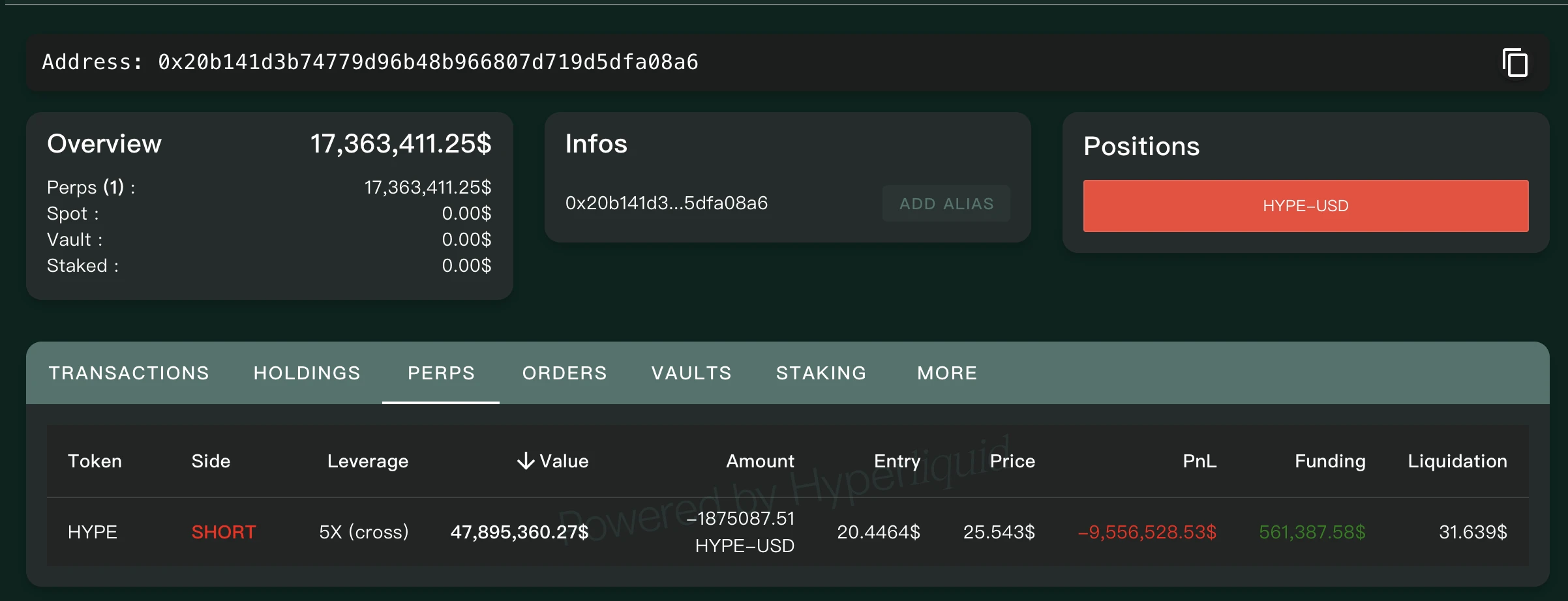 HYPE 做空派: 5 倍做空,持仓量超 187 万枚 HYPE
