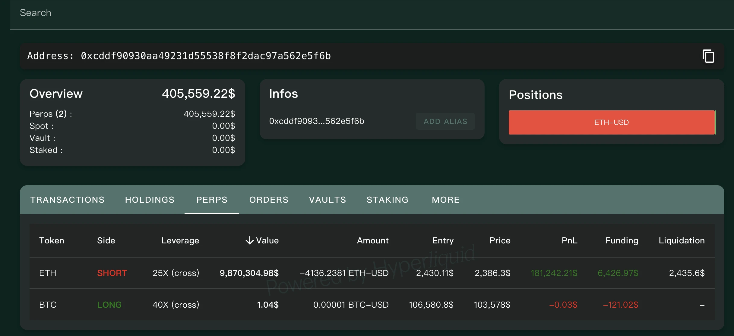 昨日,沉寂四年的地址 0xcddf 以 25 倍杠杆做空 41851 枚 ETH,仓位价值 1.03 亿美元,开仓价 2514 美元,爆仓价 2525 美元;随后,因 ETH 上涨,其最终亏损 246 万平仓;在平完 ETH 空后,其转头用剩余资金追多 BTC:以 106, 580 美元的价格 40 倍开多 166 枚 BTC,仓位价值 1760 万美元,最终仅耗时 45 分钟就亏掉 17.5 万美元。但其后来又再度 25 倍开空 ETH,浮盈后再度滚仓,目前仓位已逐步增加至 4136 枚 ETH。最新资料显示,该地址 25 倍杠杆做空仓位已降至 980 万美元左右,目前浮盈约 18 万美元。