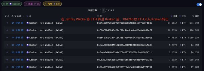 在以太坊联合创始人 Jeffrey Wilcke 将 105,737 枚 ETH 转进 Kraken 后,又有差不多数量的 ETH (104,746 枚) 通过 7 个地址从 Kraken 提出。 这有两种可能: 1⃣这是 Jeffrey Wilcke 的操作:将 ETH 转进 Kraken 后又通过多个地址提出,目的是通过交易所转一手防止后续追踪而非要出售这些 ETH。 2⃣这是