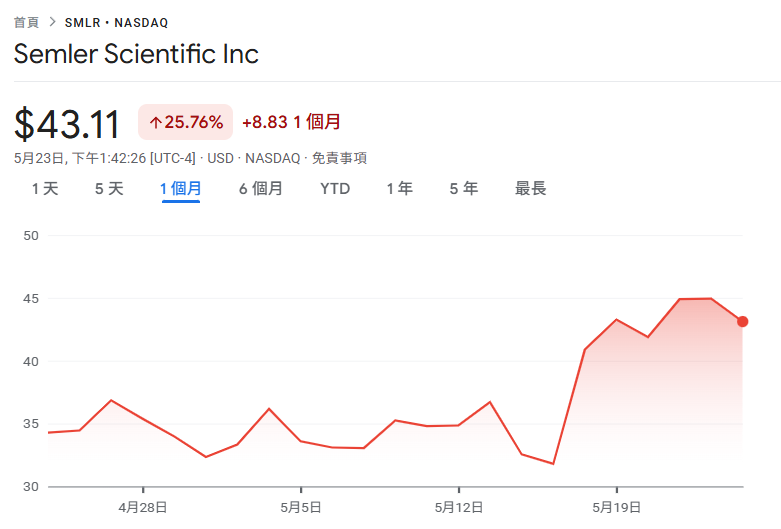 据Google财经数据显示,自 Semler Scientific 去年开始启动比特币储备计划以来,其股价也持续攀升,并在去年底一度冲上近 75 美元。虽然当前其股价已经回落至 43 美元,但近 1 年其股价也上涨了 88%,近 1 个月涨幅达到 26%。