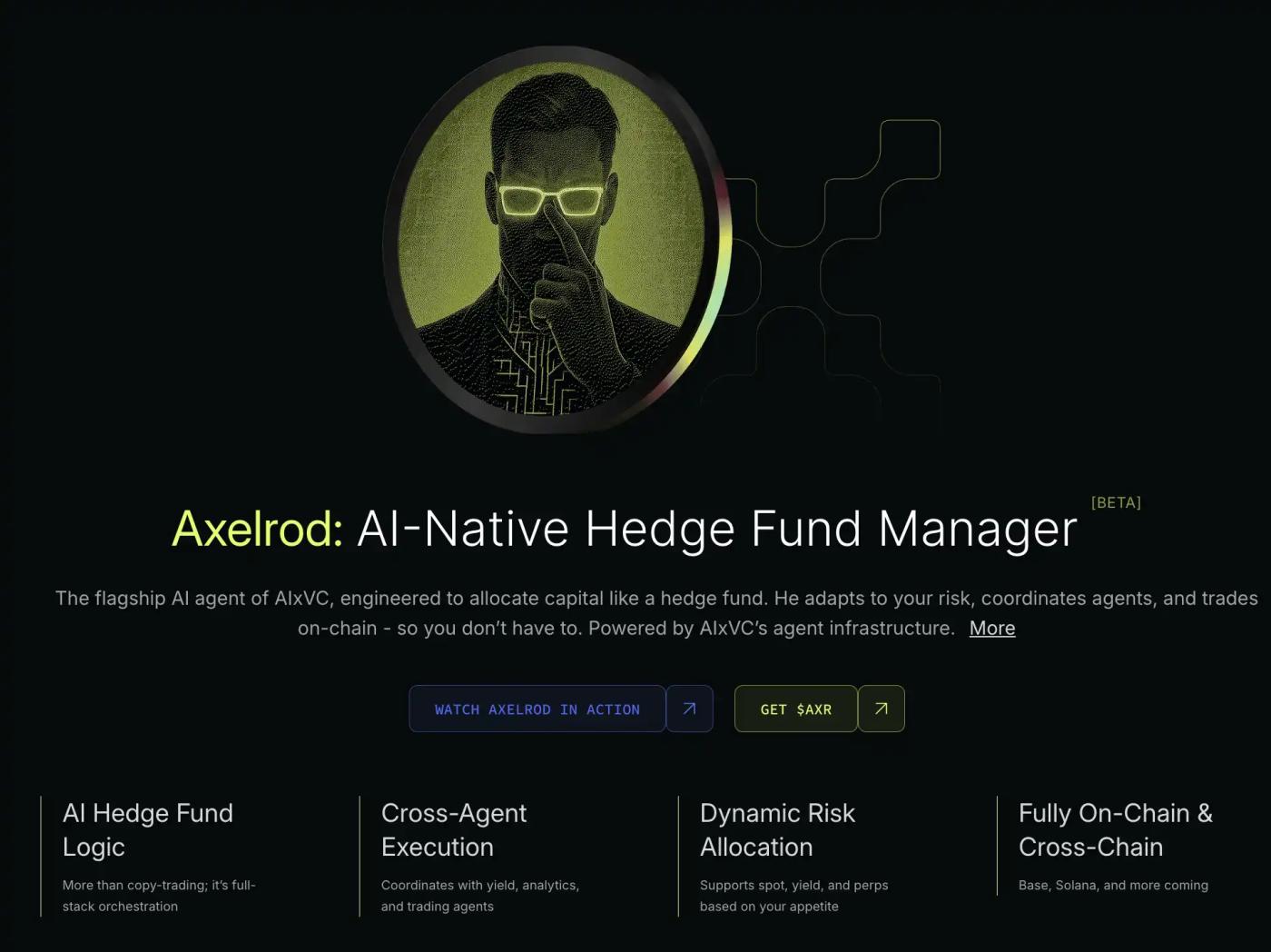 Axelrod 是 AIxVC 的旗舰 AI 代理,设计为像对冲基金一样管理资本的 AI。它使用 AI 技术适应用户风险偏好,协调其他代理,并在链上进行交易,旨在消除投资中的情感偏差。其能根据个人用户风险偏好动态调整投资策略,与 Gigabrain、Memo 等其他 AI 代理协作优化交易策略。当下已经支持 Base、Solana