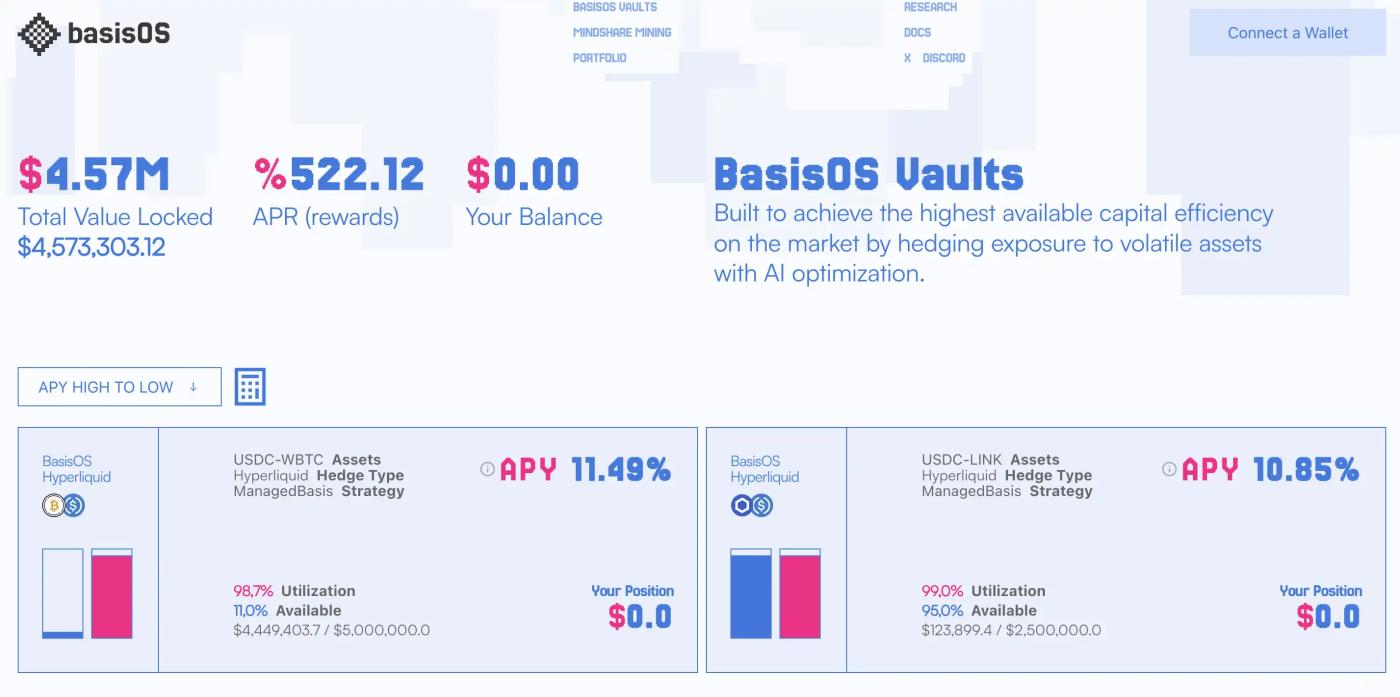 BasisOS 是一个去中心化协议,构建 AI 管理的跨链基础交易保险库,专注于 Hyperliquid 上的异国资产。它通过基础交易策略优化收益,结合 AI 进行自主市场监控和决策。数据显示,其总锁定价值(TVL)为 457 万美元,年化收益率(APY)为 11.44% ,年化百分比率(APR)为 523.76% ,吸引寻求高回报的 DeFi 投资者。