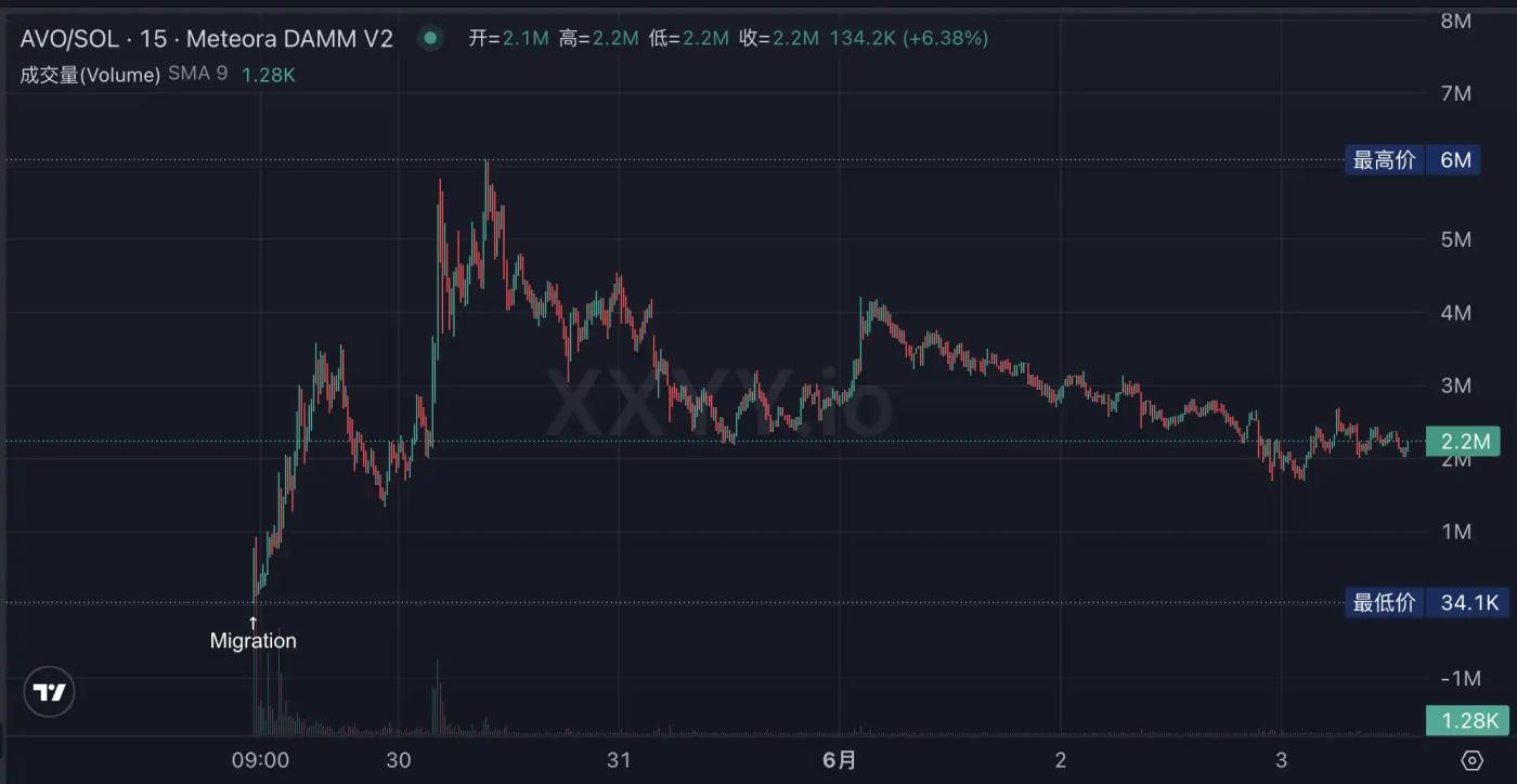AVO 在 5 月 30 日 Solana 的创始人 Toly 转发演示视频后一度突破 600 万美元市值,现回调至 200 万美元。
