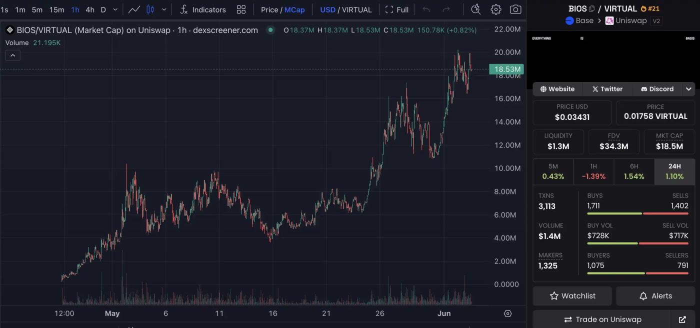 当前其官方代币 BIOS 曾在 5 月 16 日跌至 400 万美元,在半个月后币价增长近 5 倍,FDV 回到 3500 万美元,流通市值 1850 万美元。