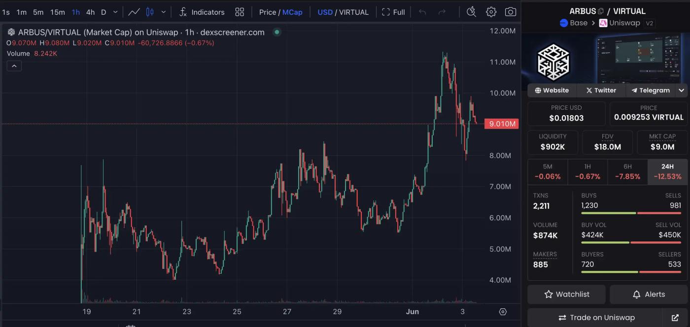 其代币 ARBUS 最高市值突破 1100 万美元,现市值报价 900 万美元。