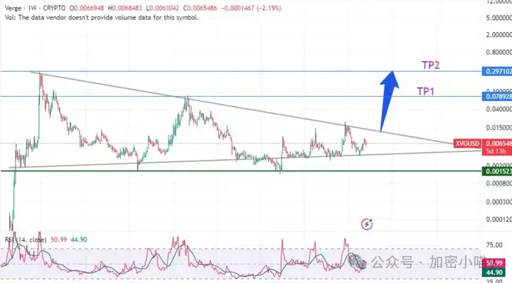 技术面上,自2017年历史高点以来,XVG长期处于对称三角形整理,当前已接近形态末端,或预示即将突破。如趋势延续,XVG或在2025年底再次挑战历史高位。