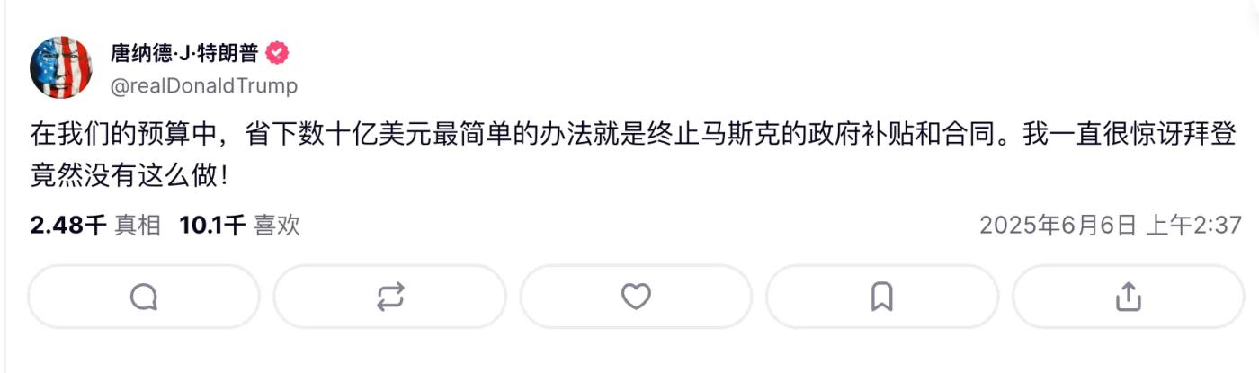 特朗普:终止马斯克政府补贴将节省数十亿美元开支链捕手06-06ChainCatcher 消息,美国总统特朗普在 Truth Social 发文表示,节省预算最简单的方式就是终止对埃隆·马斯克的政府补贴和合同,“这将节省数十亿美元。我一直很惊讶拜登没有这么做!”来源免责声明:以上内容仅为作者观点,不代表Followin的任何立场,不构成与Followin相关的任何投资建议。喜欢收藏 评论分享相关推荐All-in stationCEO ether.fi:比特币和以太坊目前都还不是高质量的加密货币。All-in stationArbitrum团队宣布增购 ARB代币,上涨对项目核心运营的投资。ARB0.11%Crypto BriefingArthur Hayes 出售更多ETH并投资 DeFi 代币ENA0.52%