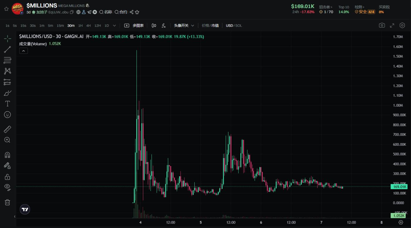 这个主打“在链上抽彩票”的代币,以“每小时开奖”吸引了大量链上赌徒。GMGN行情显示,其市值从百万起步一路拉升至 1900 万美元(见下图①处),随后又在短短几小时内暴跌至不足 200 万美元(见下图②处),再次拉起、FOMO 爆发,市值直逼前高(见下图③处),仿佛在坐链上情绪的过山车。